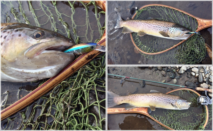北海道の中でも比較的積雪量の少ない帯広ですが、今冬は雪が多め。しかも風によって運ばれた雪が吹き溜まった河川敷は、スノーシュー(かんじき)無しでは歩くのが困難です。加えて当日は強風で体感温度は-10℃ぐらいで、西の空には雪雲があり日差しがあるのはあと2~3時間かと思われる。川面を見渡し怪しい流れを見つけ、短時間勝負開始!ラインの先に結ぶハードコア ミノーフラット70Fをダウンクロスにキャストし、重くて速い流れから弾き出された小魚をイメージしながら反転流の中へ流し込みボトムコンタクト&浮上を繰り返しながらの軽いトゥイッチを入れた瞬間、明らかにボトムの無機質な感触とは違う振動が…瞬時にアワセを強めに1発!ダウンでのHitと重い流れを使い下流へ走ろうとする魚に対し、無理はせず疲れるのを待ってから寄せて無事にランディング。元々、十勝川には居なかった魚種のブラウントラウト。産卵の痕跡もあり複雑な心境でしたが、今年初の本流釣行でもハードコア ミノーフラットは大活躍でした。