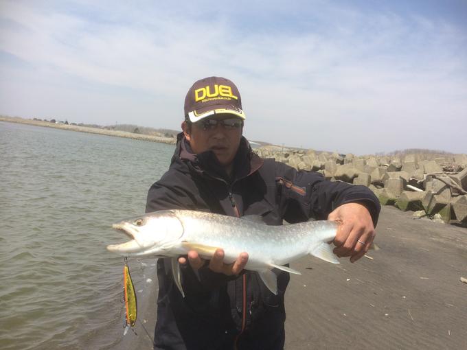本流の河口が雪代で濁りが強く釣りができる状況じゃないので、小規模河川の河口に春アメマスを狙いに行きました。昨年の記録的な回遊量の激減で稚魚も少なく、集まるアメマスも少ない状況でしたが、アメマスと鮭稚魚の量が揃ったタイミングに運良く遭遇できました。河口でボイルしている時に発生する波紋を見た限りあまり個体が大きくないと判断し、ライトなタックルで数釣りを楽しんでみました。クロスキャストし緩やかな流れを使いながらドリフトさせ、時折ルアーがヒラ打ちするようにトゥイッチをさせながらターン。ルアーが足元に戻る2m先で強烈なアタリが! ほぼ向うアワセの状態ながら60オーバーとすぐにわかる強烈な抵抗、ルアーはフラットミノーの95SPなのでフックサイズはOK、ロッドはミディアムパワーなのでOK、しかしラインは0.3号! これがヤバかった…。抵抗する際にラインが魚体に巻かれないようにコントロールし時間をかけ体力を削いでいき、浅瀬に誘導してキャッチ!ここではこの時期にしかお目にかかれないサイズの立派な♂アメマスに出会えました。