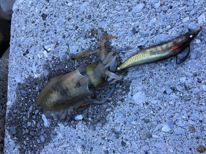 ポイントを変え、ベイトの多いテトラからの釣行。エギもベイトカラーに変更。ゆるい潮ではありましたが、ゆっくり潮に乗せてフォールしていると、明らかにフォールとは異なるラインテンションがかかり、合わせると子イカがヒット。小さいイカでしたが確実にラインでアタリが取れました。イカはリリース。