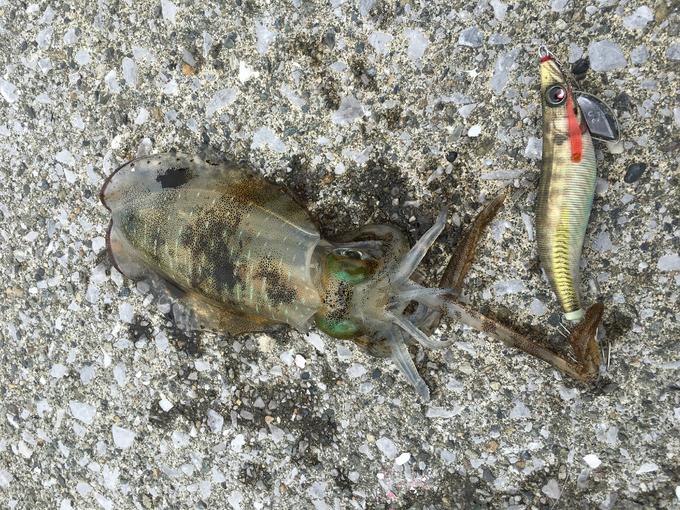 濁りが見られたので、アピールの強いゴールド下地のエギを選択すると、元気の良いの アオリイカが釣れました。かわいいサイズなのでリリース。