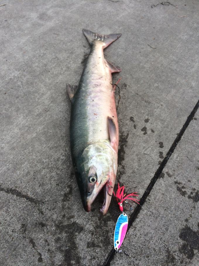 仕事を終え、一路港へ。先日とは違うポイントで釣れており、更に混み合う釣り場へ。二方向からキャストされるポイントなので魚がスレるのは早いと予測し、ほかの釣り人がキャストしてないところへキャスト。システムは前回と同じ仕様でアピール重視でリトリーブしていると、突然抑え込まれるバイト!すかさずフッキングすると猛烈な抵抗。ド派手なジャンプと止まらないラン、ドラグファイトを楽しみつつリフト&リーリングし、ランディングしたのは、若干ブナっ毛が入った立派な体格の♂。その後は、散発ながらもアタリはありましたが、フッキングまでは至りませんでした。