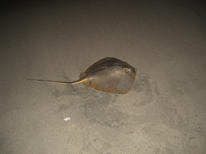横幅65cm程のアカエイ 今年はマゴチ狙いするとこいつばかり スーパーエックスワイヤー8は強度的にかなり優秀な気がする