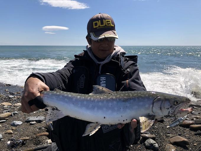 前日に続き同じポイントで更なる大物を求めてきました。波高1.5m、うねり強め、川の流れ出しの脇でボイルしている個体を発見。しっかりと水を掴めるミノーが良いと感じ遠浅なポイントですがミッドダイバー115をチョイス。ティップを上げ気味にしてレンジコントロール。カレントの重さが抜けた瞬間、連続トゥイッチを入れるとHit!パターンは前日に把握していたので、状況に合わせたアジャストで釣果につなげることができました。
