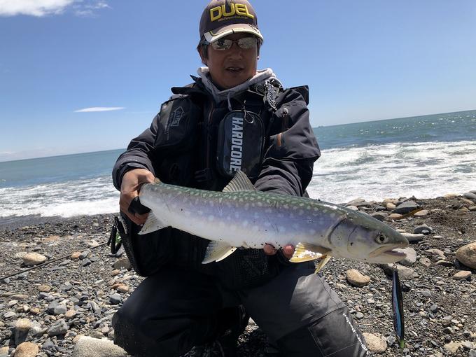 先の個体をリリースし、自分の体勢を整え再スタート。ルアーは同じくヘビーショット125、斜め横からの風をものともしない飛行姿勢!着水がド派手なのは御愛嬌ということで、激熱ゾーンから離れた所に着水させてリトリーブ。ルアーに受ける抵抗の変化を感じ取りながらスピードコントロールしていると、今ルアーがあるであろうエリアでボイル発生!すかさずトゥイッチを入れて猛アピールすると反応してくれたのは♀アメ!ルアーを使いこなせたと感じた1尾でした。