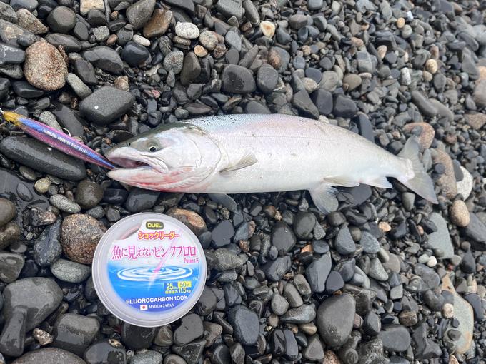 釣果情報が乏しいポイントでキャストを繰り返し時間だけが過ぎる中、魚が起こしたであろう僅かな海面変化を見つけ、リーリング中のルアーを通すと1発でヒット!慎重に波に乗せランディングすると小柄ながら綺麗なサクラマスの姿を見せてくれました。 新色のHKVKはナチュラルなのにハイアピールの合わせ技なので1軍カラーですし、通常だと5号のショックリーダーを使っている方が多い海サクラマス釣りですが、魚に見えない効果で7号を使用することができ、波打ち際で小砂利に叩かれて切れることも無くなりました。