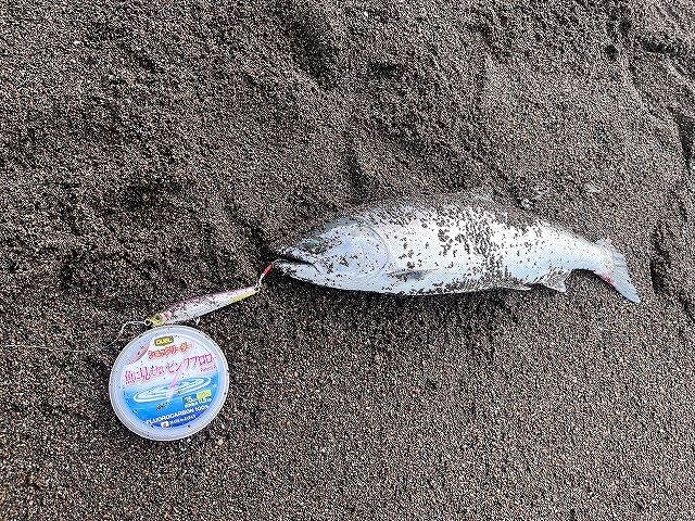 1匹目が釣れてから1時間程で満潮潮止まりで魚の反応も薄くなり、休憩をしているとだんだんと霧が濃くなり視界は70m程に。海面を見ると潮流がかすかに出始めたことで流れてくるゴミも多くなってきたので、フックをテール側にシングルフック1本にしゴミがらみを少なくし、それでもフックに乗ったゴミを外すように強めのトゥイッチを入れていると右から向かってくる跳ねを発見。回遊ルートを予想してキャストしトゥイッチで誘っているとヒット!サイズは小ぶりながらも隣の人のルアーの横を通り過ぎて自分のルアーにヒットしたので、ケイムラカタクチのカラーアピールとピンクフロロショックリーダーのステルス性能を実感しました。