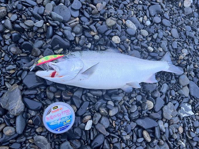 河口からの流れ出しを狙えるポイントに立ち、日の出前後は岸寄りに魚がいると想定しヘビーミノー90HGGCをチョイス。この日は波とウネリが若干あるのと、流れ出しの中で浮き上がらずに岸際までアピールするのを心掛けてトレースコースをキャスト毎に少しずつずらして探っていると、流れ出しから外れたタイミングでHit!10数人並ぶポイントでのファーストヒットをとれたのも魚に見えないピンクフロロショックリーダーの効果だと思います。