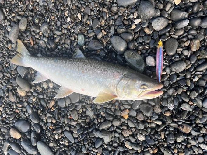 有名河川の河口周辺は、人でごった返しており魚もスレているので人の少ないサーフをランガンしていると、岸から10m程の所で抑え込むようなアタリの後にトルクのある首振りを感じた瞬間、良型のアメマスだと確信。波高が低くランディングに良い波待ちをしている間に魚体を確認。長さはないが太いので最後の抵抗はトルクのある抵抗と予想し、慎重にランディングのタイミングを計ってキャッチ。撮影時に口から半消化のイワシを吐き出したので、ベイトが豊富なことでこの体形なのね。って妙に親近感が沸く1尾でした。