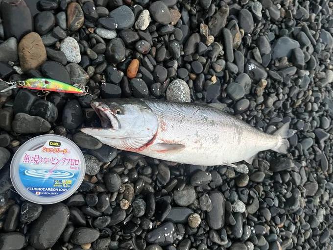 仕事前の短時間釣行、人気河川の河口は渇水で閉ざされた状態。遡上できずに岸際を回遊するサクラマスの群れや跳ねが目視できる明るさになって、キャストしたルアーの後方で跳ねが発生。余分なアクションを入れずに棚だけを意識してストレートリトリーブをしているとHit!照度が低い時だけじゃなく、十分な明るさになってもこのカラーへの反応は良いと再認識しました。