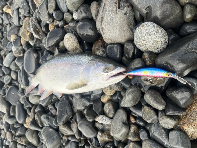 日が昇り、海の濁り具合が笹濁り状態の為、ヘビーミノーのカラーローテンションをしていると、捩っている群れを発見。群れの横をスローめにトレースすると反応してくれました。