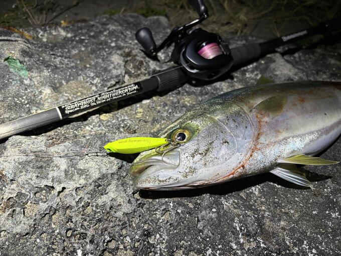シーバス狙いでまさかの青物。夜に青物は初めてでした。波打ち際にいるベイトが小さかったためモンスターショット65をチョイス。マットチャートが今回良かったのかは正直青物なので不明ではありますが夜にはこのカラーが釣れるというのは定番化しつつあります。主力としてぜひ!