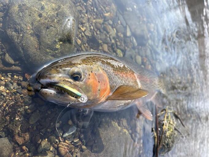 減水した冬の小河川で、人為的プレッシャーを受け警戒心の強いニジマスに見切られないようにシミーフォールでボトム迄沈め、チョンチョンと小さな誘いでボトム付近でアピールするとヒットしました。