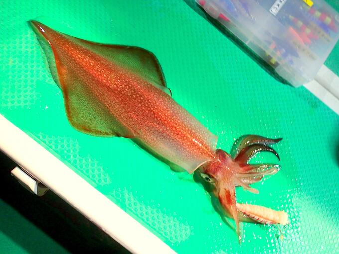 激渋の釣行だったが、サイズダウンの新製品や近日発売予定品を利用して、なんとかムギイカとヤリイカにまでたどり着いて、ホッとしていた瞬間、今までとは異なる強烈な引き。ガッチリとエビスッテミニ90mm抱えて上がってきたのは、今シーズンのなかなか顔を見せてくれなかったケンサキイカの雄イカ、パラソルマイカ(ケンサキイカ)だ。 いよいよ、本格シーズが始まる手ごたえを感じられた、楽しい釣行だった。