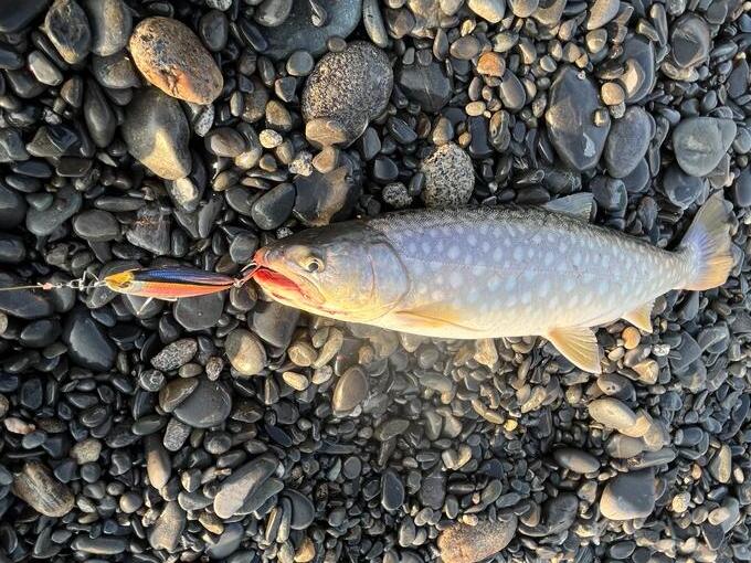 小河川の河口から50m程離れているが、砂浜から浸透水が染み出ているのを潮位が下がってから気づき、ベイトが岸寄りに溜まりやすい場所だと確認したので、スローリトリーブでもアピール力の高いSBショットを岸から40m弱の範囲で探っていると、波によってできた濁りとの境目でHitしました。