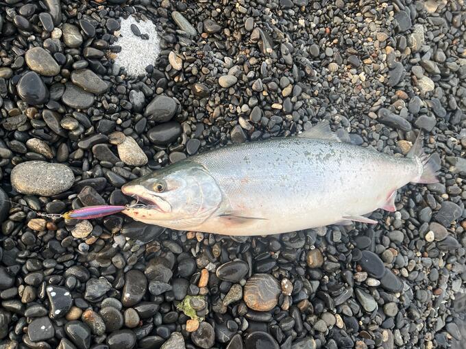 遡上の為に河口に寄り付いたサクラマスも日に日に人為的プレッシャーにより口を使わなくなっており、モンスターショット95やヘビーミノー90では反応が悪いので、サイズダウンで口を使わせる作戦がハマりました。遠投性能と基本アクションとリトリーブレンジが海サクラマス釣りでは重要な要素ですが、モンスターショット65かなり相性のいいルアーです。