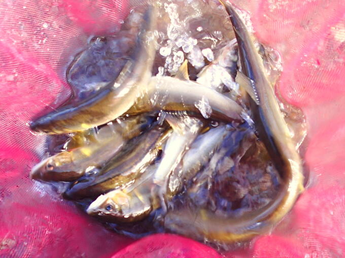 所属する鮎友釣りクラブの競技会が終了し、仲間たちと夕刻の僅かな時間、水中糸はアーマード® FH 鮎 水中糸 0.06号 GYB、ハナカン回り糸は魚に見えないピンクフロロ™ ショックリーダー 0.8号 SP、3本イカリのハリスは魚に見えないピンクフロロ™ ショックリーダー 0.8号 SPで、真剣に試し釣りをしました。好調な釣果に、確かな自信を付けました。