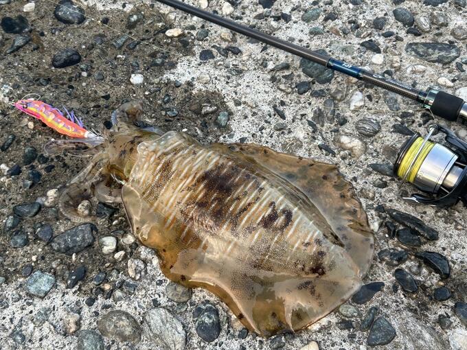 この日の夕方に長崎南部へアオリイカ、太刀魚を狙い。まずはマグパタ3.0号まずめオレンジKVMOを使用してのエギング。足元には小さな新子サイズ。右から左へ潮も流れ出し少し沖の水深のあるエリアへロングキャストして中層からチェック開始。いい感じでエギもなじむなーと思っていた瞬間、「トンッ」とのあたり。即合わせ成功で上がってきたのは700gの夏の男の子でした。