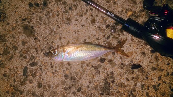 大阪港のナイトゲームではアジが釣れます。釣れるのは小型サイズのアジですが、ゲーム性が高くて面白いです。ベイトタックルなので、あまり軽いジグヘッドは使えませんが、ワームカラーとワームサイズが合えばガップリ喰ってきます。