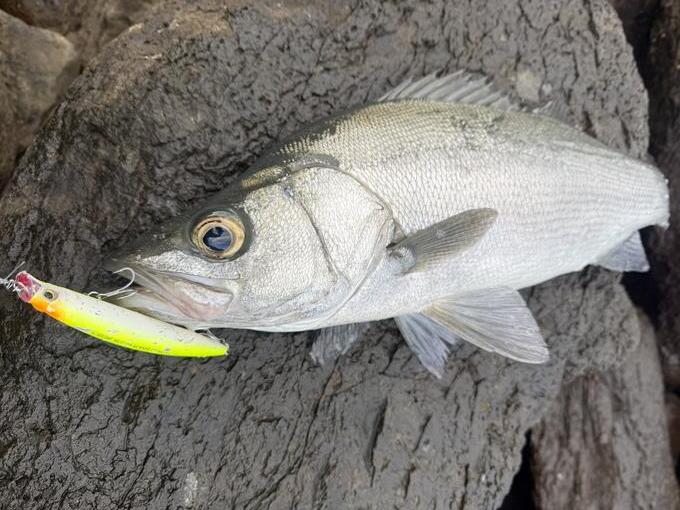 少しサラシが濃ゆいので、視認性のいい、パールを使ってトレースコースを刻みながら引いてくるとヒットしました!