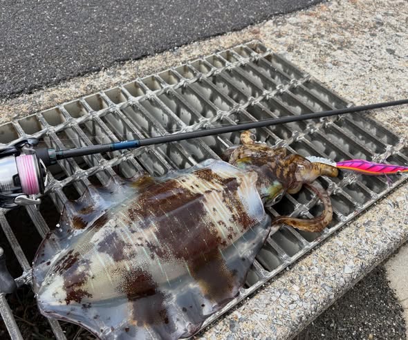 2026年アオリーQ誕生30周年。当時の仕様をそのままに。得意の跳ね上げ後のテンションフォール。 満潮からの潮の動き出し、横に動く潮に馴染ませながらいったんボトムに着底。使用しているのはKVRPモンスターマスターカラー。その後一回目のしゃくりを入れようとしたその時、ずっしりとした良型ののり。上がってきたのは1.2kの良型のアオリイカでした。 3.2秒の沈下速度が扱いやすい