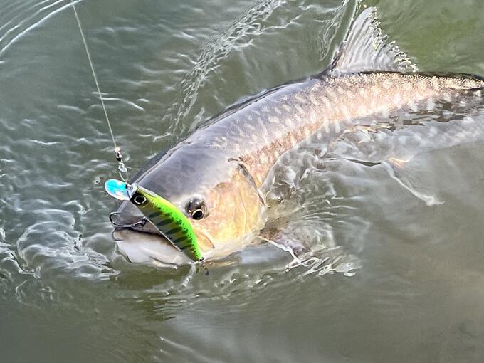 前日に掴みかけたヒットアクションを確認すべく、色違いのヘビーフラット80Sを使用。今年の新色はホログラムリップとUVテールで全方位へのアピールが効くと思い、アップクロスからダウンまで全域でユラユラパタパタとアクションするようにリーリングしていると、立ち位置からほぼ真横の角度にルアーが差し掛かった瞬間にヒットしました。