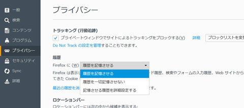 ② 左側のメニューから「プライバシー」を選択します。表示された項目の中から「履歴」を探し、その中にある「Firefoxに○○○」とある部分を「履歴を記憶させる」に変更します。既に「履歴を記憶させる」になっていた場合は、既にCookieは有効になっています。