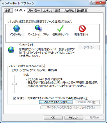 ② 「セキュリティ」タブを開き、「セキュリティ設定を表示または変更するゾーンを選択してください」とある部分で「インターネット」が選択されている事を確認してください。選択されていなければ「インターネット」をクリックします。その後、「レベルのカスタマイズ」をクリックします。