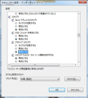 ③ 設定の中ほどにある「スクリプト」の中の「アクティブスクリプト」の項目を確認します。「有効にする」が選ばれていない場合は、Javascriptが無効になっている状態です。「有効にする」を選択して「OK」をクリックします。既に「有効にする」が選ばれていた場合は「キャンセル」で閉じます。