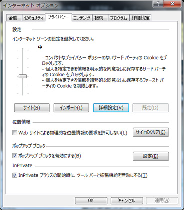 ④ 次に「プライバシー」タブを開き、「詳細設定」をクリックします。