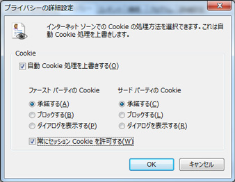 ⑤ 「自動Cookie処理を上書きする」とある項目をチェックが入っている状態にして、「ファーストパーティのCookie」「サードパーティのCookie」の項目それぞれ「承諾する」を選択します。また、「常にセッションCookieを許可する」もチェックが入っている状態にします。全て変更したら「OK」をクリックします。