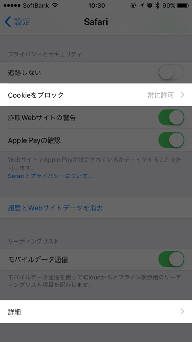 ③ Safariの設定メニューから、Cookieの設定は「Cookieをブロック」、Javascriptの設定は「詳細」をタップします。まずは「Cookieをブロック」をタップします。