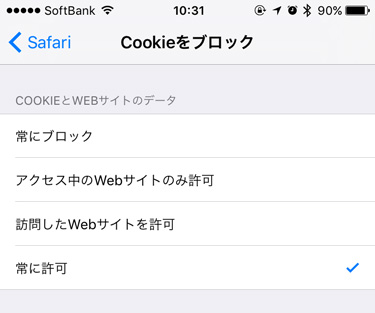 ④ Cookieをブロックの設定メニューにある「COOKIEとWEBサイトのデータ」を「常に許可」にします。既に「常に許可」にチェックが入っていた場合は、Cookieは有効になっています。設定が完了したら左上の「<Safari」で前の画面に戻ります。
