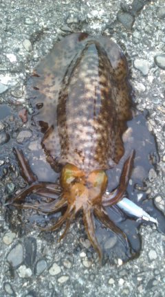 新子がエギを追っかけてきますがなかなか乗りません。 あきらめて居残りの親イカを狙っていると、突然ひったくるようなアタリ!この時期にしては大満足の700gサイズでした!