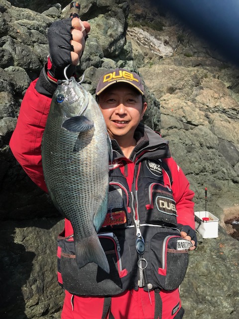 デュエルクラブ懇親釣り大会で大分県鶴見半島へ。くじ引きの結果、福岡から一緒に参加した大島さん、松本さんと当番瀬の小鼻へと瀬上がりとなった。朝まずめからクロは頻繁にヒットするが、サイズは30~35cm級とサイズアップしない。3人とも同じ状況が続き、結局私は納竿間際に釣った38cmが最大で終了となり、4位という結果であった。