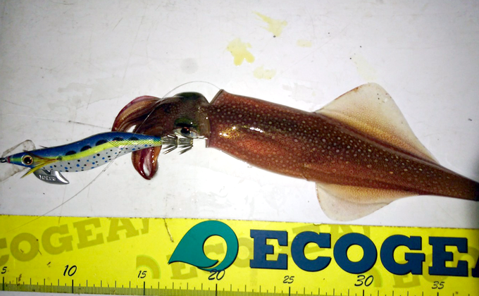 ヤリイカねらいでエギングに行って来ました。潮が早く、初めは2.5号のエギを使ってましたがあっという間に流されてしまうため3.5号にサイズアップ。あまりシャクラずにワンジャーク後のスローリトリーブでドリフトさせると反応良かったです。