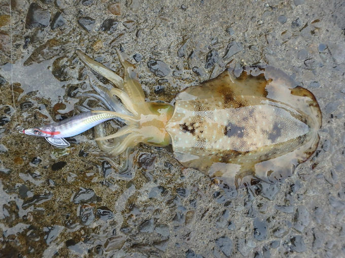 三重県は紀東周辺でエギングをしてきました。一つ目のポイントは例年より藻が少なく、それが原因なのかノーバイト。サーフに藻場が絡むポイントに移動し、こちらも藻は少なめだがいい潮目が入っていたので、潮目の回りを攻めると…スゥーっと持って行くアタリに合わせをいれてHIT!!400gのアオリイカGET♪(HITパターン=トゥイッチ3回+テンションフォール、エギ=EZ-Qキャストラトル3.5号) 移動する潮目を追いかけるように攻め、3杯のアオリイカの追加に成功。潮目が無くなると同時にアタリも遠のいたので、地磯へポイント移動。広い地磯をラン&ガンで攻め、600gを頭に数杯追加に成功し納竿となった。