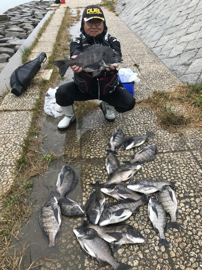 雨の中、久しぶりに朝から夕方までやりました。午前中は潮が早く、思うように仕掛けが入らず苦労しました。午後からは雨が強くなりましたが、流れが緩くなりなんとか18匹ゲットすることが出来ました。サイズは、49cmを頭に32cmまで18匹でした。差し餌は、ボケでした。それでも食い込まず針はずれが10回くらいありました。釣り上げたチヌは、ほとんどくちびる1枚でした。