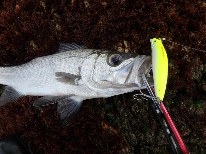長崎県南部の野母崎へヒラスズキ狙いに行って来ました。当日の気象予報は西風やや強く波高2.5mのち2m。この前日は一時的に寒気が戻り西からの強風が吹き荒れました。一帯では風速10m以上を観測し、計画段階では予報以上の波高(うねり)を心配しましたが、実際の現地での風向きは北北西位からで、ポイントに対して右手から左への風向き。このため風速の割には大荒れではなく、いい感じのサラシ具合です。波が良ければこの時季の野母崎!直ぐに反応がありました。ファーストコンタクトはヨーヅリ「マグダーター125F」に!若いヒラスズキをキャッチ。その後もエリアを小刻みに、ポイントを休めながらランガンする展開。飛距離を要するシーンでは「ヘビーショット105」をチョイス。結果、午前中3時間弱で2人で10バイト超を得ることができ、春の磯ヒラを楽しめました。