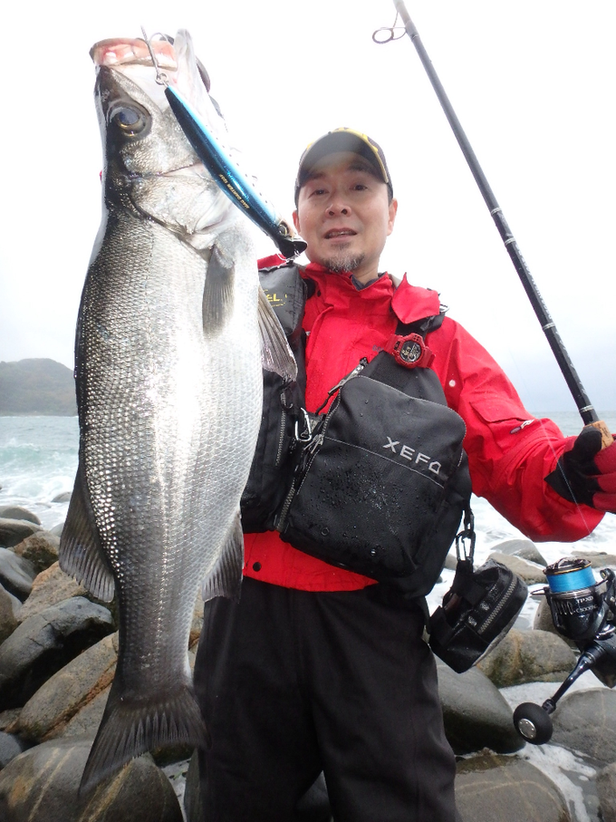 昨日に続いて糸島半島へ! 当日の気象予報は北西風、波高2のち1.5m。実はこの日、沖磯へヒラスズキ釣行を予定していましたが、前日の釣行で海鵜が頻繁にベイトを捕えるシーンが見られたので、波風がある状況下での展開が気になり再び当地へ。ゲームスタートの夜明けから1時間程は、北風が強く雨も残っていました。この時点ではサラシは薄く強風の影響で飛距離が昨日より劣っています。ブレイク付近で急に立ち上がる波は、潮位とのマッチングが悪く、シンペン系が使い辛い状況。手堅く「マグダーター125F」でブレイク狙いです。そして間もなく「ガンッ!」と引ったくる感じのバイト! ファーストヒットは60cmクラスのヒラスズキ! 糸島半島ではまずまずのサイズです。その後、潮位が上がるにつれて波高も上り、少し風速は落ちたものの、ブレイク付近はセットの間があるいい感じの白濁状態。こうなると強いです「ヘビーショット105」! 上げ止まりまでの約3時間、ヒラの回遊を捉えて2人で計8ヒットを獲ることができました。