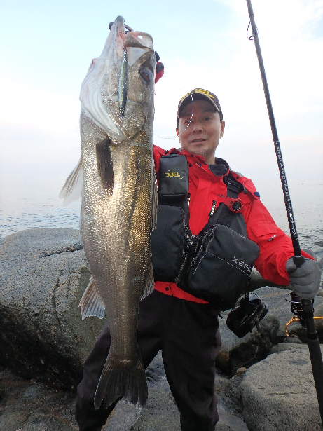糸島半島にシーバス狙いに行って来ました。全国的に気温上昇のこの週末。潮回りが小さい影響もあり、フルキャストからのリトリーブにルアーへの抵抗が乏しい感じ。実はこの前日も同様の状況下でシーバスの回遊を捉えることができず、この日はエリアをサーフよりに移動してのチェック。ここはブレイクのちょい手前まではゴロタが入っており、さらに沖合は砂底へ変化しています。澄み潮時の実績がやや高いエリアです。開始から1時間程経過し空も明るくなり諦めモードが漂う中、少し離れていたメンバーに待望のヒット! 70cm弱のシーバスをキャッチです。そしてその数分後、私も続きました! フルキャストした「ヘビーショット105」に「グンッ!」とバイト。中々のファイトでランディングしたのは80cmのシーバス! 昨日の状況からあまり期待はしていませんでしたが、自然相手ゆえに常に試行錯誤が必要であると、改めて実感した釣行でした。