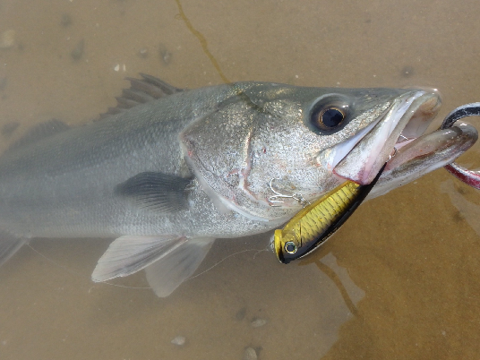博多湾サーフのトップゲーム! 始まりました。早朝が干潮だったこの日、波打際のドシャローには沢山のベイトを確認。この状況下、朝一からシーバスが元気一杯です。ファーストヒットは「シルバーポップ75」に水深50~60cmのエリアから。ファーストヒットからランガン3時間弱、途中1時間程バイトが途切れましたが、流れが効き出すと再びバイトが活発に! この時合いでは、ポップ音とスプラッシュがより際立つヨーズリ「3Dインショア ポッパー」に高反応! 潮が上げるにつれて目視できるベイトも増し、サイズ感からも数種を確認。先週までの状況から一転して、この1週間で一気にベイトが密になりました。この日は出ませんでしたが、チヌ(クロダイ)、キビレも近いと思われます!