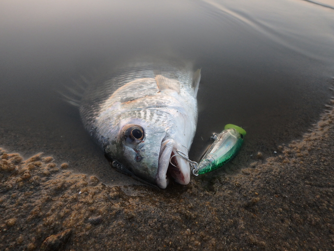 博多湾サーフへトップゲームに行って来ました。この日は早朝4時40分が最干潮時刻。丁度上潮が動き始めた頃合いからスタートです。波打際には沢山のベイトが群れており水面でザワザワしています。いつものサーフの光景の中、直ぐに反応がありました!「ジュポッ!」と地味ながら鋭くポッパーにバイトしたのは40cmも満たない小型のキビレ。今季はこのサイズが多い感じ。ヒットルアーはヨーズリ「3Dインショアポッパー」です。開始1時間弱はメンバーそれぞれ3~4バイトとマズマズなスタートでしたが、その後のランガンではチェイスはあるものの、ルアーを追尾する姿からは貪欲さが感じられません。高活性時に見せる海面を揺らして豪快にしつこくアタックするシーンを見ることはなく、結果として後半はミスバイトや喰い込みが浅いバラシも多く、課題が残る展開でした。