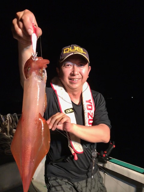 先週に引き続き夜焚きのヤリイカ釣りに相ノ島沖へ。日暮れと共に船に明かりが灯るとヤリイカが釣れ出し、それからは入れ食いに突入。数もダブル、トリプル、時には4匹と釣れて楽しませてくれる。納竿の時間までヤリイカの食いは落ちる事なく釣れ続け、思う存分楽しむ事が出来た。