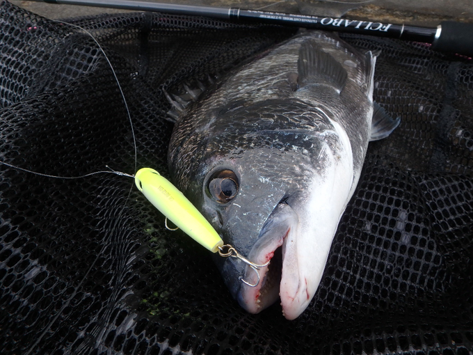 博多湾西部に位置する今津湾へチヌのトップゲームに行って来ました。当日は夜明け前の4時半が最干潮時刻。干潟のシャローが続く当地は、干潮時のショアラインは水深不足気味。しかしあえてこの条件の下、朝一から水深1m程のエリアをチェックしつつ、潮が上げるにつれてさらに浅場へ狙うエリアを拡大して行く作戦! そして干潟をランガンすること2時間、潮位も随分上がり、朝一は干上る寸前だったポイントで、やっとこさファーストコンタクト! フルキャストで沖目を狙っていたヨーヅリ「3DSポッパー65」にバイトです。このポッパーは細身のシルエットで飛距離抜群!遠浅のポイントではいつもその実力を発揮してくれます!当地の特徴をまとった黒光りの良型チヌをキャッチできました!