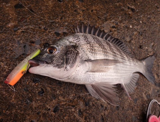 この夏、足繁く通う今津湾のトップチヌへまた行って来ました。この日は小雨が降っており、夜明け時刻を迎えてもまだ暗く、少し遅めの6時頃から実釣開始。ポイントでは潮が右に流れており、脈々と上潮が効いています。最近はこの右流れ(上潮)の時がバイト数が多いです。いつもより少しテンポアップ気味に「シルバーポップ75」を「カポカポッ!」とアクションさせていると、頻繁にセイゴがジャれてきます。ベイトっ気も多く浅場に溜まっている感じです。そんな状況の中、開始から30分弱、ルアーの背後に「モァ~」と海面が揺らぐトップチヌ独特の前アタリ! そして次の瞬間「ジュポッ!」とバイト! ちょっと小振りな40cmのチヌをキャッチしました! インスタ始めました。https://www.instagram.com/ichirohiradance/