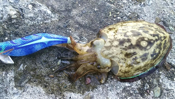 夕まづめが近付き、ローライトになったのでケイムラボディーのエギに変更!ボトムをネチネチと探ってたら、フォール後にラインがスゥ~ッと引き込まれて。合わせも決まって、気持ちよかったですが、サイズはちっこいしコウイカやし。まあ釣れただけOKかな?