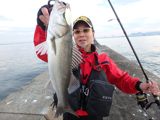博多沖防へシーバス狙いに行って来ました。まだ暗い内からのスタートでしたが、明るくなるにつれて堤防際には沢山のベイトを確認。ベイトは時より何かに追われて水面で騒ついています。この状況下、夜明け直後はトップで狙いましたが不発。このため早くも「ソリッドスピン」の投入です。一旦ボトムまで沈めてからリフト&フォールでチェック。すると直ぐに反応あり。しかしヒットするのはセイゴサイズばかりで、ボトムからミドルレンジに群れで回遊している様子。その後もサイズアップできないまま経過し、まさかの堤防付近を優雅に泳ぐ「スナメリ」の姿を目撃!早めの納竿となりました。