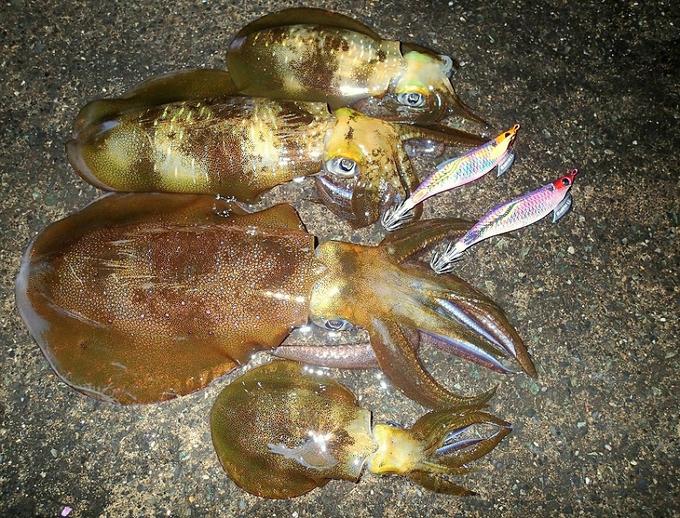 新着エギEZ-Q®フィンプラス™ランガンの実釣テストを昼過ぎ午後1時にスタート。その一投目のケイムラカラーにいきなりの良型450gヒットにしてやったり!夕マズメまで小型300g2尾とリリースサイズ3尾を追加し薄暮の午後五時過ぎ、最後の一投ブルー夜光カラーにズドンと680gで締めくくった。EZ-Q® フィンプラス™ ランガンのショートプラは大成功でした。