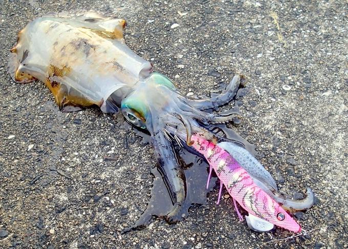 早朝一番、急激に低下した海水温でアオリイカの反応も激渋かなと予測。そこで、きびきびしたシャクリの誘いよりもエギ自身の持つ波動で静かに誘う方がベターと判断。ダートマスターを選び、パタパタフットの波動を信じショートストロークで滑らかに誘う。スイーッと誘えば、いきなりドンッ!と来ました。