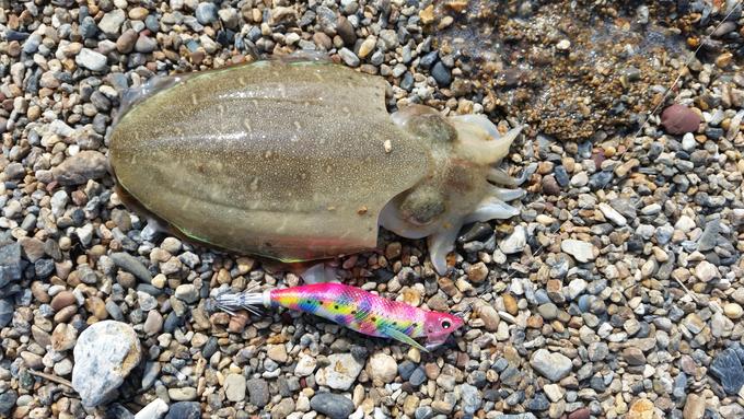 コウイカの刺身が食べたい!との妻からの要望で、福井県は小浜にエギング釣行してきました。沖にシモリと藻場が絡むサーフにエントリーし、探ると…持って行くアタリに合わせを入れて…HIT!本命のコウイカGET♪(HITパターン=ショートピッチジャーク2回+テンションフォール、エギEZ-Qマグキャスト 3号)その後、コウイカをもう1杯追加しミッション完了で納竿。